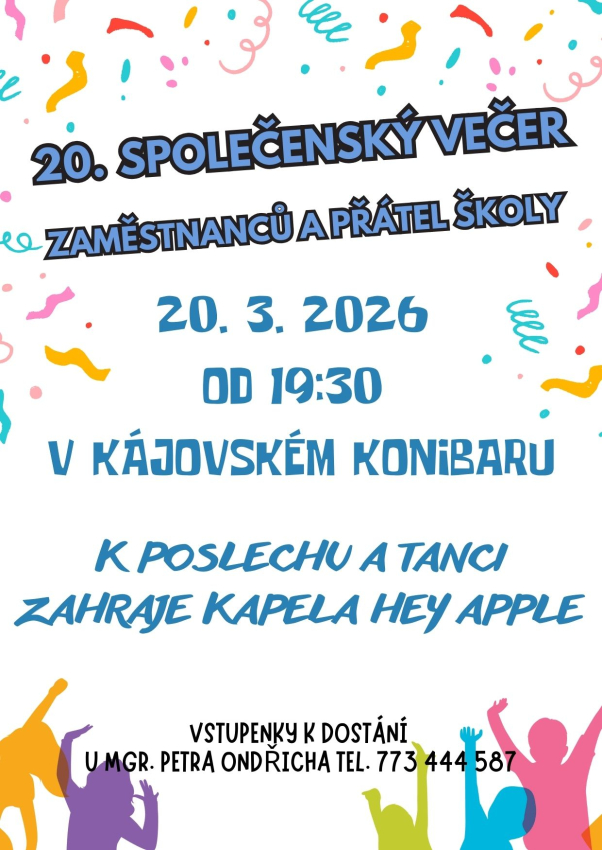 Dne 20. března 2026 se v kájovském Konibaru uskuteční od 19:30 hodin již 20. společenský večer zaměstnanců a přátel školy. K tanci a poslechu bude hrát skupina Hey Apple. Přijďte si zatančit, zazpívat, pobavit se. Vstupenky jsou k dispozici u Mgr. Petra Ondřicha (tel. 773 444 587).